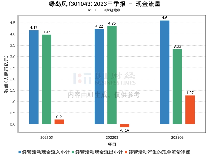 在现金流量方面,绿岛风2023年三季度的经营活动产生的现金流量净额为1.27亿元,相比上年同期的-1411.84万元,实现了从负转正的大幅提升。经营活动现金流入小计为4.6亿元,相比上年同期的4.22亿元增长了8.96%。经营活动现金流出小计为3.33亿元,相比上年同期的4.36亿元减少了23.62%。
