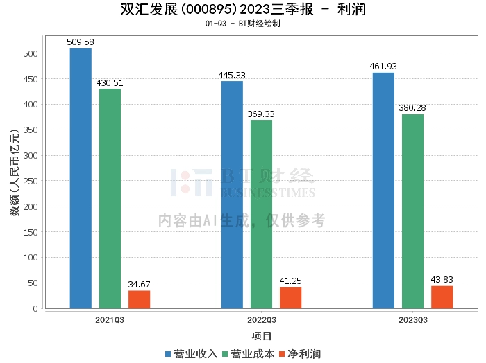 在利润方面,双汇发展2023年三季度的营业收入为461.93亿元,相比上年同期的445.33亿元有所增长。营业成本为380.28亿元,较上年同期的369.33亿元有所增加。净利润为43.83亿元,较上年同期的41.25亿元有所增长。毛利率为17.68%,较上年同期的17.07%有所提升。净利率为9.49%,较上年同期的9.26%有所提升。