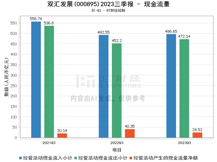 在现金流量方面,双汇发展2023年三季度经营活动产生的现金流量净额为24.51亿元,较上年同期的40.35亿元有所下降。经营活动现金流入小计为496.65亿元,较上年同期的492.55亿元有所增长。经营活动现金流出小计为472.14亿元,较上年同期的452.2亿元有所增长。
