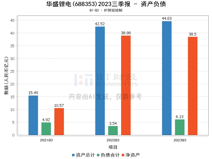 华盛锂电2023年三季度的总资产为44.63亿元,相比上年度末的45.39亿元有所下降。负债合计为6.13亿元,略高于上年度末的6.06亿元。净资产为38.5亿元,较上年度末的39.32亿元有所减少。资产负债率为13.74%,比上年度末的13.36%有所上升。