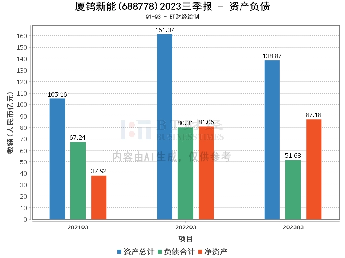 从资产负债方面来看,厦钨新能2023年三季度的总资产为138.87亿元,相较于上年度末的153.8亿元有所下滑。负债合计为51.68亿元,较上年度末的70.3亿元有所减少。净资产为87.18亿元,相较于上年度末的83.5亿元有所增加。资产负债率为37.22%,较上年度末的45.71%有所降低。这些数据显示,公司的负债规模在逐渐减小,净资产在增加,整体的资产负债状况正在改善。