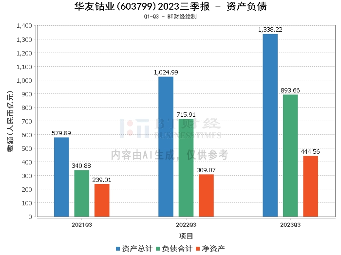 华友钴业2023年三季报显示,公司总资产达到1338.22亿元,相比上年度末的1105.92亿元增长21%,主要是期末公司以GDR、借款等筹资方式收到的货币资金增加及固定资产、在建项目投入增加。负债合计达到893.66亿元,相比上年度末的779.1亿元有所增加。净资产达到444.56亿元,相比上年度末的326.82亿元有显著增长。资产负债率为66.78%,相比上年度末的70.45%有所下降。