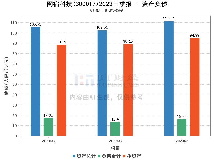 从资产负债方面来看,网宿科技2023年三季度末的总资产达到111.21亿元,相较于上年度末的105.03亿元有所增长。负债合计为16.22亿元,较上年度末的14.29亿元有所上升。净资产为94.99亿元,较上年度末的90.73亿元有所提升。资产负债率为14.58%,较上年度末的13.61%有所上升。