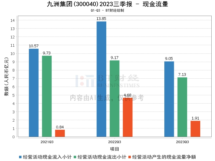 在现金流量方面,公司2023年三季度的经营活动产生的现金流量净额为1.91亿元,较上年同期的4.68亿元有所下降。经营活动现金流入小计为9.05亿元,较上年同期的13.85亿元有所减少。经营活动现金流出小计为7.13亿元,较上年同期的9.17亿元有所减少。