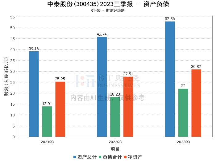 在资产负债方面,中泰股份2023年三季度的总资产为52.86亿元,较上年度末的46.84亿元增长了12.86%。负债合计为22亿元,较上年度末的18.61亿元增长了18.23%。公司的净资产为30.87亿元,较上年度末的28.22亿元增长了9.39%。资产负债率为41.61%,较上年度末的39.74%有所上升。