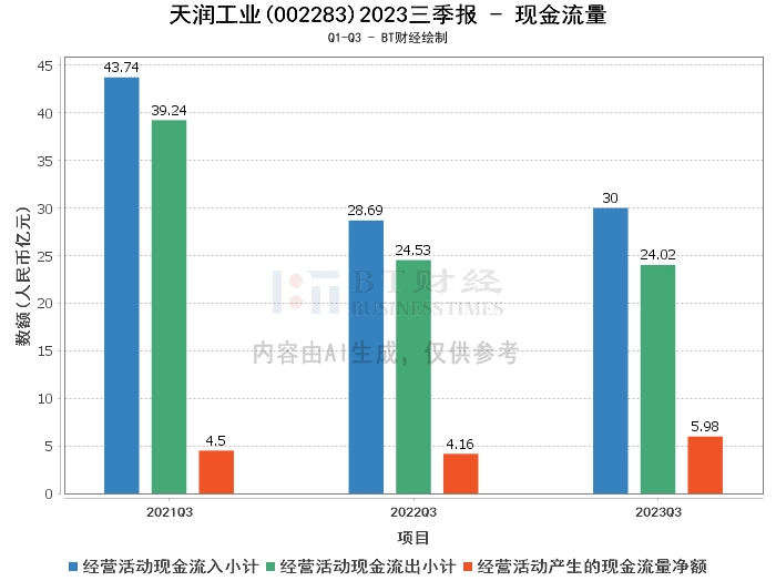 在现金流量方面,公司2023年三季度的经营活动产生的现金流量净额为5.98亿元,较上年同期的4.16亿元增长了43.54%。经营活动现金流入小计为30亿元,较上年同期的28.69亿元有所增长。经营活动现金流出小计为24.02亿元,较上年同期的24.53亿元略有减少。这表明公司的现金流量状况良好,经营活动产生的现金流量能够满足公司的经营需求。