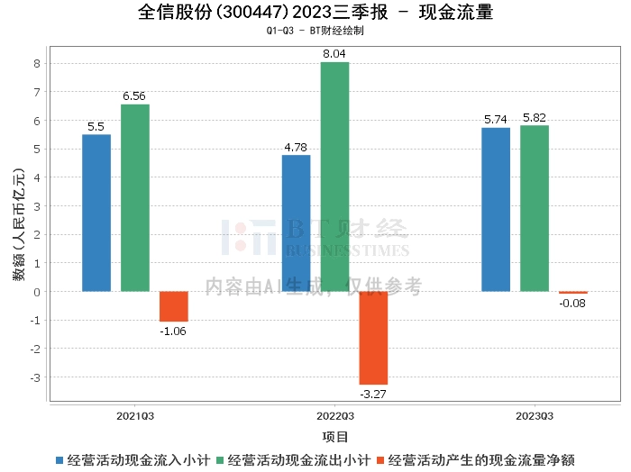 在现金流量方面,全信股份2023年三季度经营活动产生的现金流入为5.74亿元,较上年同期的4.78亿元有所增长。经营活动产生的现金流出为5.82亿元,较上年同期的8.04亿元有所减少。经营活动产生的现金流量净额为-849.93万元,较上年同期的现金流量净额有所改善。