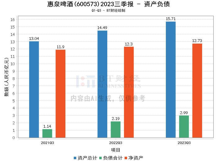 从资产负债方面看,惠泉啤酒2023年三季报显示,公司总资产为15.71亿元,相比上年度末的14.09亿元有所增长。负债合计为2.99亿元,相比上年度末的1.89亿元有所上升。净资产为12.73亿元,相比上年度末的12.21亿元有所增加。资产负债率为19.01%,相比上年度末的13.39%有所上升。