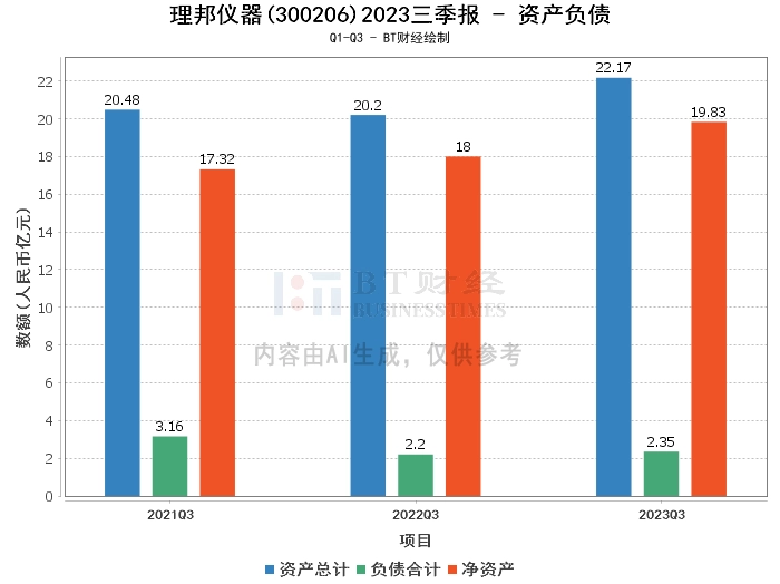 从资产负债方面看,理邦仪器2023年三季度末的总资产为22.17亿元,相比上年度末的22.36亿元略有下降。负债总额从上年度末的3.85亿元降至本报告期末的2.35亿元,净资产从上年度末的18.51亿元增至本报告期末的19.83亿元。资产负债率从上年度末的17.22%下降至本报告期末的10.59%,显示出公司负债结构的优化。