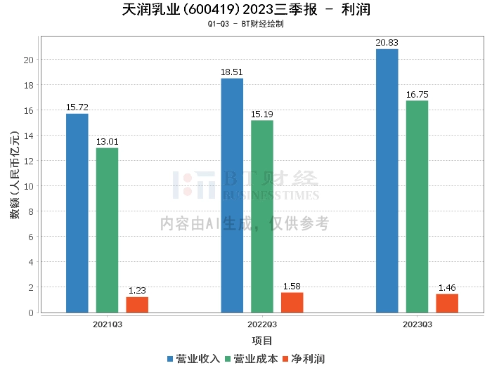 在利润方面,天润乳业2023年三季度的营业收入为20.83亿元,相比上年同期的18.51亿元增长了12.50%。营业利润为2.14亿元,较上年同期的1.81亿元有所增长。然而,净利润为1.46亿元,较上年同期的1.58亿元略有下降,主要是由于市场淘汰牛价格下降,以及公司合并新农乳业后增加亏损所致。