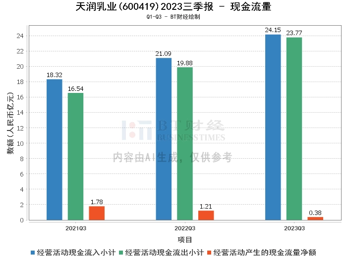 在现金流量方面,天润乳业2023年三季度经营活动产生的现金流量净额为3821.44万元,较上年同期的1.21亿元大幅下降68.38%,主要是由于公司增加原材料采购量所致。经营活动现金流入小计为24.15亿元,较上年同期的21.09亿元有所增长。经营活动现金流出小计为23.77亿元,较上年同期的19.88亿元有所增长。