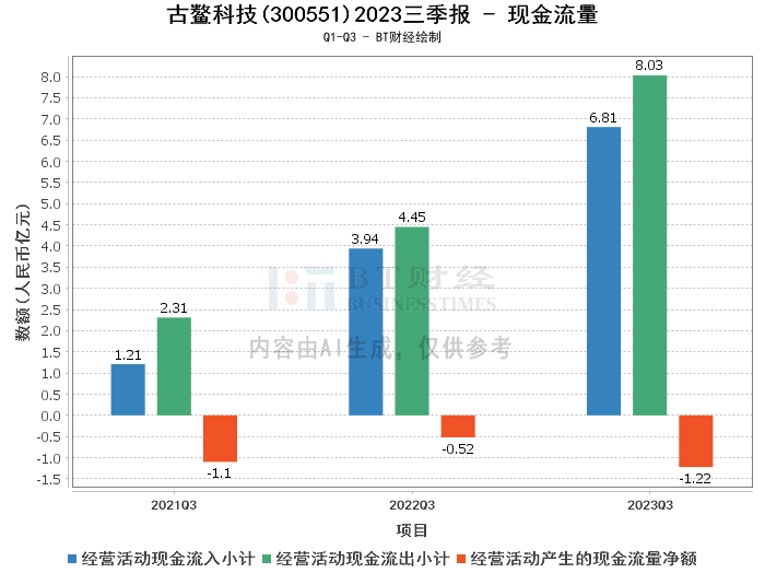 在现金流量方面,古鳌科技的经营活动产生的现金流量净额为-1.22亿元,相比上年同期的-5162.03万元下滑了136.64%。经营活动现金流入小计为6.81亿元,相比上年同期的3.94亿元增长了72.84%。经营活动现金流出小计为8.03亿元,相比上年同期的4.45亿元增长了80.45%。