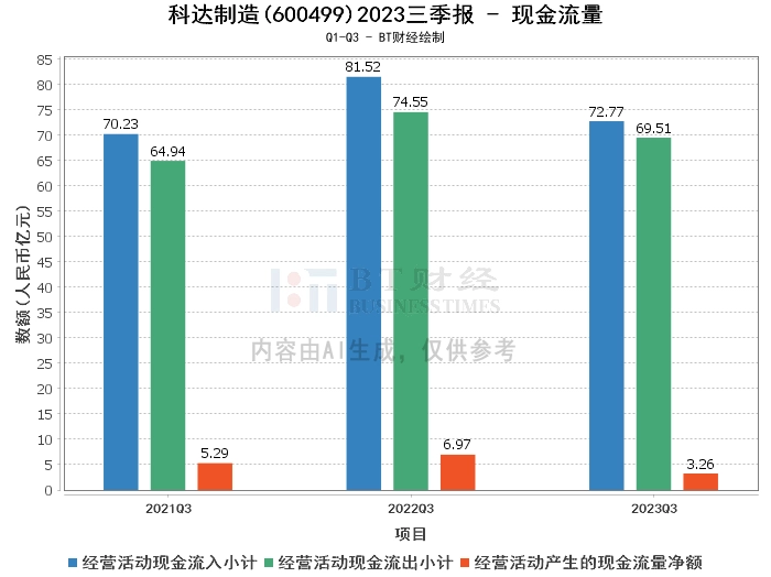 在现金流量方面,科达制造2023年三季度经营活动产生的现金流量净额为3.26亿元,相比上年同期的6.97亿元减少了53.19%。这主要是由于上年同期公司销售商品、提供劳务及税费返还收到的现金较多所致。