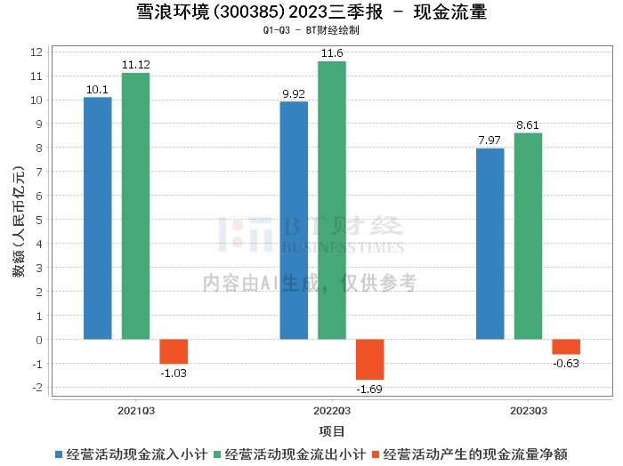 在现金流量方面,雪浪环境2023年三季度经营活动产生的现金流入为7.97亿元,较上年同期的9.92亿元有所减少。经营活动产生的现金流出为8.61亿元,较上年同期的11.6亿元减少。经营活动产生的现金流量净额为-6305.59万元,较上年同期的-1.69亿元增加62.64%,主要原因系本期支付货款比同期少。这些数据显示,公司的现金流量管理得当,经营活动的现金流量净额有所改善。