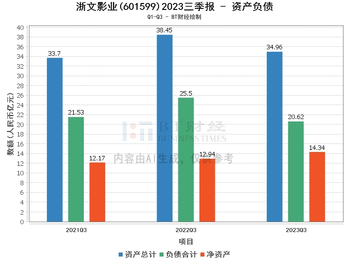 从资产负债方面看,浙文影业2023年三季度末的总资产为34.96亿元,相较于上年度末的31.14亿元,增长了12.28%。负债合计为20.62亿元,相较于上年度末的17.9亿元,增长了15.19%。净资产为14.34亿元,相较于上年度末的13.24亿元,增长了8.30%。资产负债率为58.99%,相较于上年度末的57.48%,微增1.51个百分点。