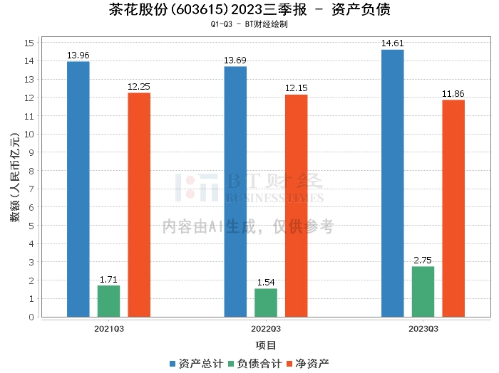 从资产负债方面来看,2023年三季度末,茶花股份的资产总计为14.61亿元,相比上年度末的13.71亿元,增长了6.61%。负债合计为2.75亿元,相比上年度末的1.65亿元,增长了66.67%。净资产为11.86亿元,相比上年度末的12.05亿元,略有下降。资产负债率为18.81%,相比上年度末的12.04%,有所上升。
