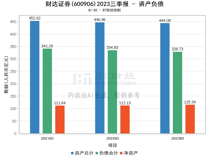 从资产负债方面看,财达证券2023年三季度末的总资产为444.08亿元,相比上年度末的438.43亿元有所增加。负债合计为328.73亿元,略高于上年度末的327亿元。净资产为115.34亿元,较上年度末的111.44亿元有所提升。资产负债率为74.03%,较上年度末的74.58%有所下降。这表明财达证券的资产规模在扩大,同时负债控制得较好,整体财务状况稳健。