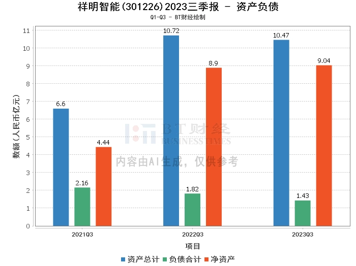 在资产负债方面,祥明智能在2023年三季度末的总资产为10.47亿元,相比上年度末的10.72亿元有所下降。负债合计为1.43亿元,较上年度末的1.68亿元减少。净资产保持稳定,为9.04亿元。值得注意的是,公司的资产负债率从上年度末的15.71%下降到本报告期末的13.65%,显示出公司负债管理的改善。