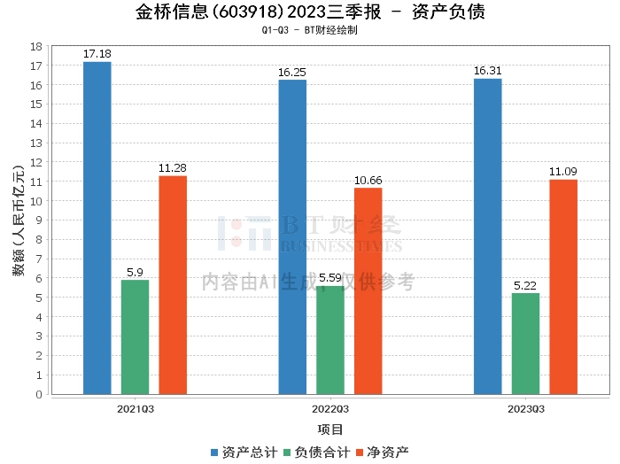 从资产负债方面来看,金桥信息2023年三季度的总资产为16.31亿元,相比上年度末的16.68亿元有所减少。负债总额为5.22亿元,较上年度末的5.88亿元也有所下降。净资产为11.09亿元,相比上年度末的10.8亿元有所增长。资产负债率为32.02%,较上年度末的35.24%有所下降。
