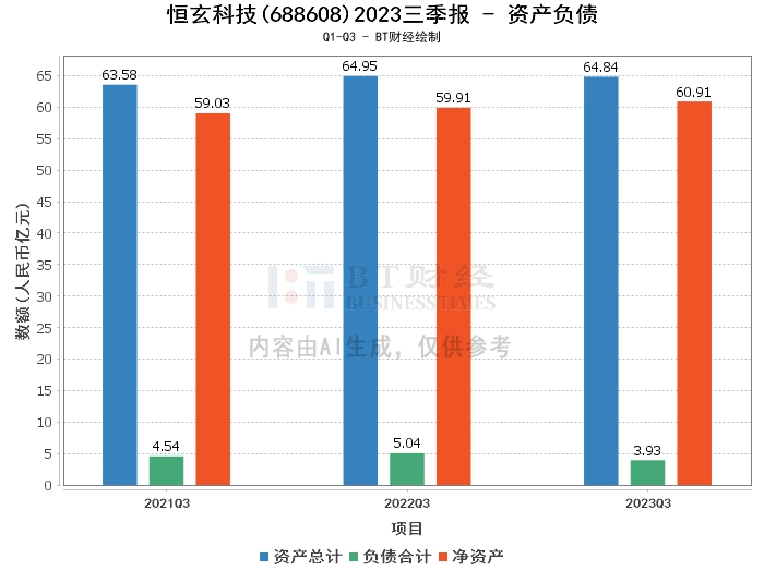 从资产负债方面来看,恒玄科技2023年三季度末的总资产为64.84亿元,相比上年度末的64.13亿元有所增长,增长幅度为1.10%。负债合计为3.93亿元,相比上年度末的4.51亿元有所减少。净资产为60.91亿元,相比上年度末的59.63亿元有所增长,增长幅度为2.14%。资产负债率为6.06%,相比上年度末的7.02%有所下降。这表明公司的资产规模在稳步增长,负债规模在逐步减少,公司的财务状况整体较为稳健。