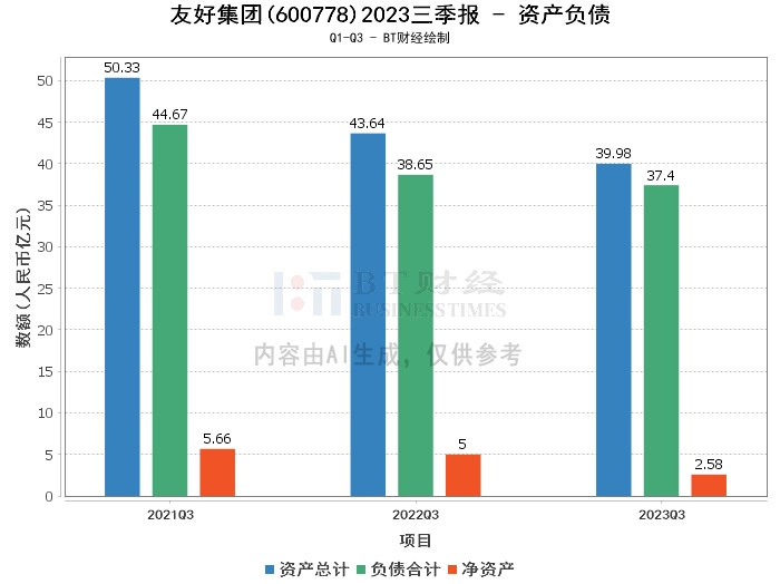 从资产负债方面看,友好集团2023年三季度末的总资产为39.98亿元,相比上年度末的42.55亿元有所减少。负债合计为37.4亿元,较上年度末的39.07亿元有所下降。净资产为2.58亿元,较上年度末的3.48亿元有所减少。资产负债率为93.54%,较上年度末的91.81%有所上升。