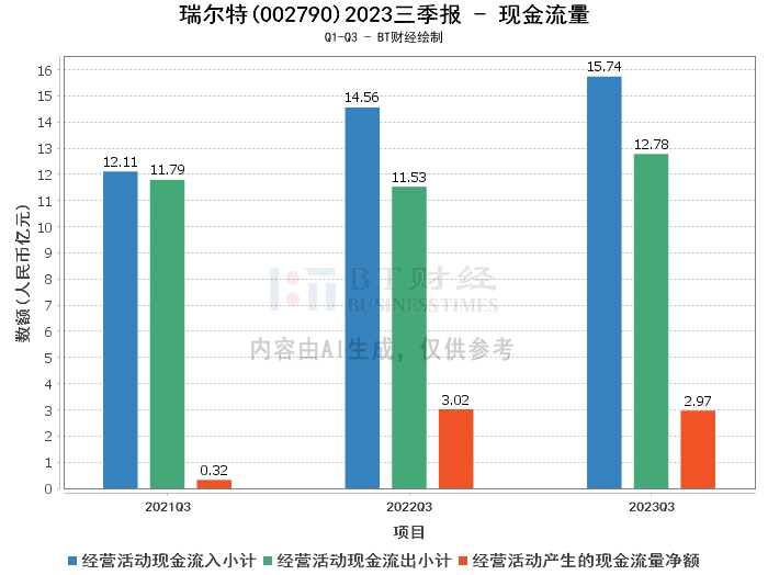 在现金流量方面,瑞尔特2023年三季度的经营活动产生的现金流量净额为2.97亿元,相比上年同期的3.02亿元略有下降。经营活动现金流入小计为15.74亿元,上年同期为14.56亿元。经营活动现金流出小计为12.78亿元,上年同期为11.53亿元。这些数据显示,公司的现金流入有所增加,但现金流出也有所增加,导致现金流量净额略有下降。