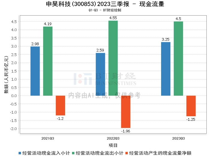 在现金流量方面,申昊科技2023年三季度的经营活动现金流入小计为3.25亿元,较上年同期的2.59亿元有所增加。经营活动现金流出小计为4.5亿元,较上年同期的4.55亿元略有下降。经营活动产生的现金流量净额为-1.25亿元,较上年同期的-1.96亿元减少36.36%,主要系本期销售商品、提供劳务收到的现金较上年同期增加、支付给职工以及为职工支付的现金较上年同期减少所致。