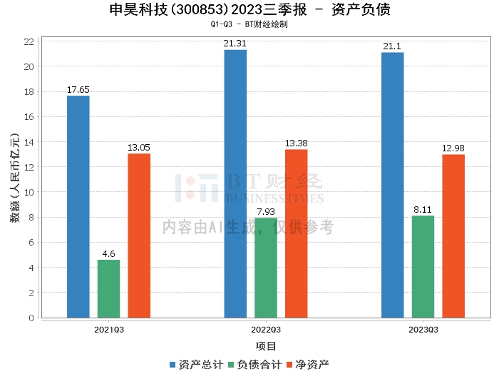 在资产负债方面,申昊科技2023年三季度末的总资产为21.1亿元,相较于上年度末的22.1亿元有所下降。负债合计为8.11亿元,较上年度末的8.88亿元有所减少。净资产为12.98亿元,较上年度末的13.22亿元略有下降。资产负债率为38.46%,较上年度末的40.18%有所下降,显示出公司负债结构的优化。