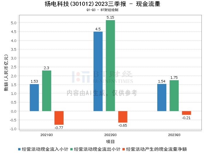 在现金流量方面,扬电科技2023年三季度报告显示,经营活动产生的现金流量净额为-2120.3万元,相比上年同期的-6457.92万元增长了67.17%。经营活动产生的现金流入为1.54亿元,相比上年同期的4.5亿元下降了65.78%。经营活动产生的现金流出为1.75亿元,相比上年同期的5.15亿元下降了66.02%。