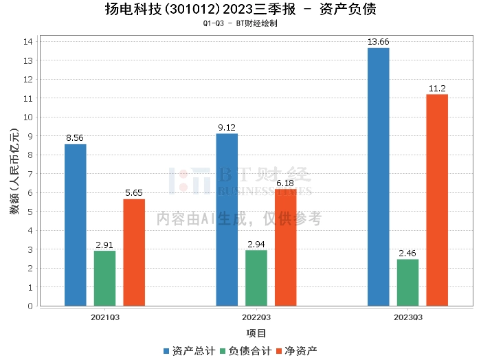 在资产负债方面,扬电科技2023年三季度报告显示,公司资产总计达到13.66亿元,相比上年度末的9.49亿元增长了43.92%。负债合计为2.46亿元,相比上年度末的3.27亿元下降了24.77%。净资产达到11.2亿元,相比上年度末的6.22亿元增长了80.08%。资产负债率为17.98%,相比上年度末的34.45%下降了47.83%。