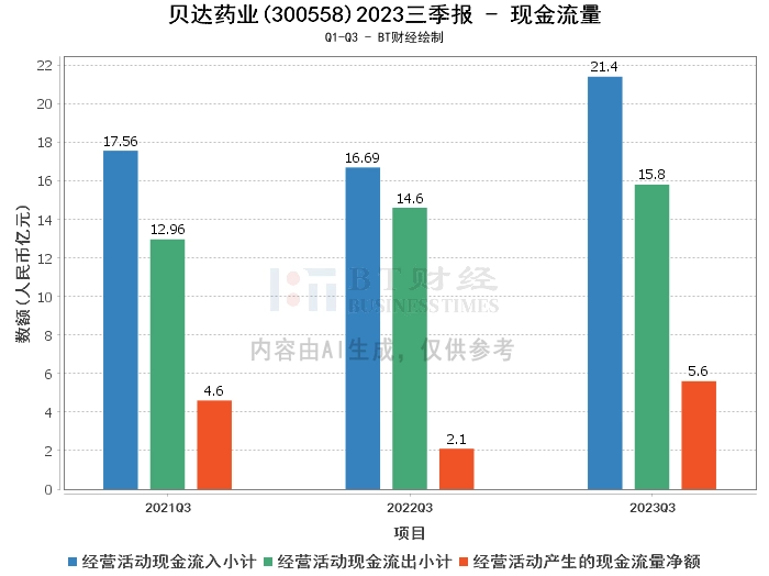 在现金流量方面,贝达药业2023年前三季度经营活动产生的现金流量净额为5.6亿元,同比增长167.07%。经营活动现金流入小计为21.4亿元,同比增长28.27%。经营活动现金流出小计为15.8亿元,同比增长8.22%。这些数据显示,贝达药业的经营活动现金流入增长较快,现金流出增长较慢,整体现金流量状况良好。