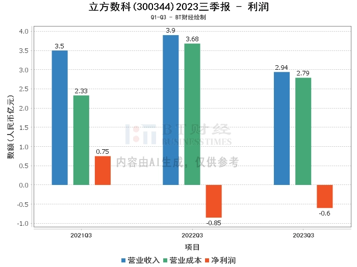 在利润方面,立方数科2023年三季度的营业收入为2.94亿元,相比上年同期的3.9亿元下降了24.42%。营业成本为2.79亿元,相比上年同期的3.68亿元减少了24.19%,毛利率从上年同期的5.43%下降到本报告期末的5.17%。归属于上市公司股东的净利润为-5972万元,相比上年同期减少了29.76%。这些变动主要是由于报告期内公司根据战略调整,减少了新品推广费用、咨询服务费以及计提应收款项坏账准备减少等因素所致。