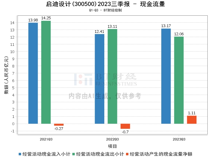 在现金流量方面,启迪设计2023年三季度经营活动产生的现金流量净额为1.11亿元,较上年同期的-7016.48万元有大幅提升。经营活动现金流入小计为13.17亿元,较上年同期的12.41亿元有所增加。经营活动现金流出小计为12.06亿元,较上年同期的13.11亿元有所减少。这些数据表明,公司的现金流状况有所改善,经营活动的现金流入增加,现金流出减少。