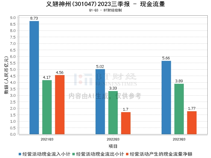 在现金流量方面,2023年三季度,公司经营活动产生的现金流量净额为1.77亿元,较上年同期的1.7亿元有所增长。经营活动现金流入小计为5.66亿元,较上年同期的5.02亿元有所增长。经营活动现金流出小计为3.89亿元,较上年同期的3.33亿元有所增长。这些数据显示,公司的经营活动产生的现金流量稳健,现金流入和现金流出均有所增长。