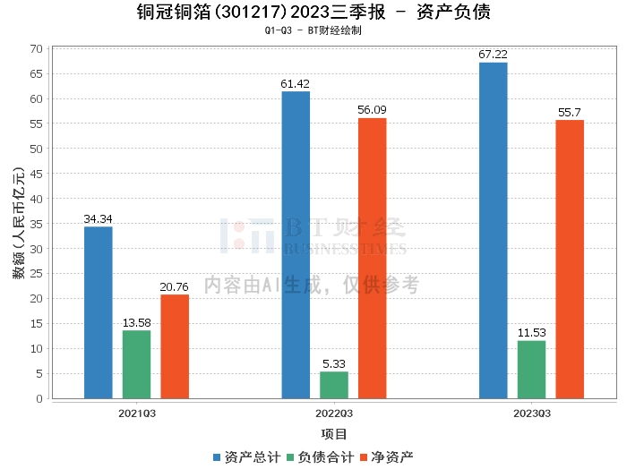 在资产负债方面,2023年三季度末,铜冠铜箔的资产总计为67.22亿元,较上年度末的62.01亿元增长8.42%。负债合计为11.53亿元,较上年度末的5.55亿元增长107.57%。净资产为55.7亿元,较上年度末的56.46亿元下降1.35%。资产负债率为17.14%,较上年度末的8.94%上升8.2个百分点。