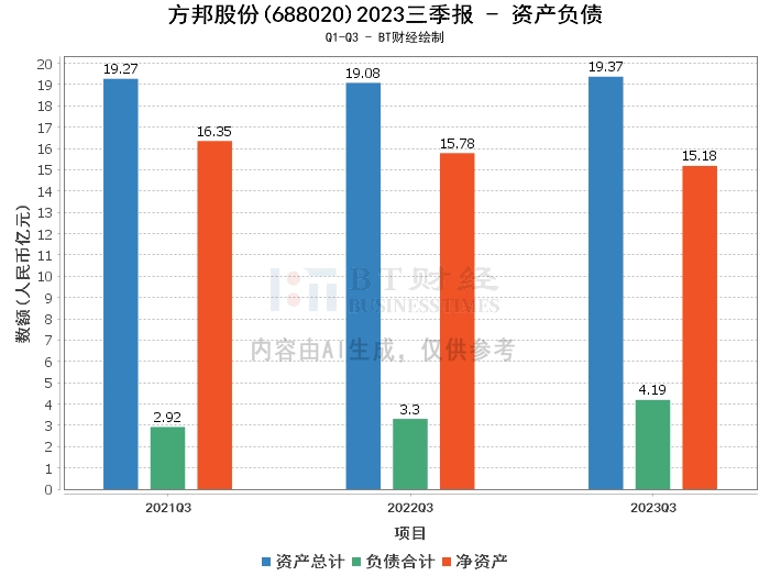 从资产负债方面来看,方邦股份2023年三季度末的总资产为19.37亿元,较上年度末的19.68亿元略有下降,变动幅度为-1.55%。负债合计为4.19亿元,较上年度末的4.08亿元有所增加。净资产为15.18亿元,较上年度末的15.6亿元有所下降。资产负债率为21.64%,较上年度末的20.72%有所上升。