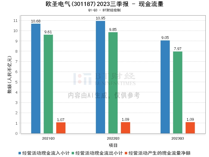 在现金流量方面,欧圣电气2023年三季度的经营活动产生的现金流量净额为1.09亿元,与上年同期的1.09亿元持平。经营活动现金流入小计为9.05亿元,相比上年同期的10.95亿元有所下降。经营活动现金流出小计为7.97亿元,相比上年同期的9.85亿元有所下降。