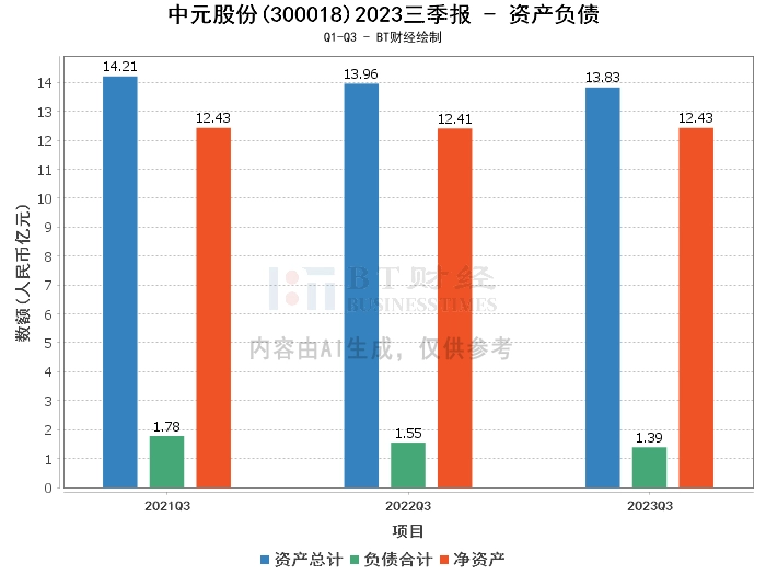 在资产负债方面,中元股份2023年三季度的总资产为13.83亿元,相比上年度末的13.88亿元略有下降。负债总额为1.39亿元,较上年度末的1.67亿元减少了16.77%,资产负债率从上年度末的12.03%降至10.08%,显示出公司负债管理的效率有所提升。净资产为12.43亿元,较上年度末的12.21亿元增加了1.80%,表明公司的净资产保持稳定增长。