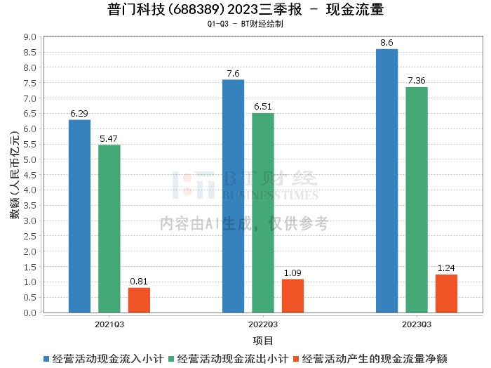 从现金流量来看,普门科技2023年三季度的经营活动产生的现金流量净额为1.24亿元,较上年同期的1.09亿元有所增长。经营活动现金流入小计为8.6亿元,较上年同期的7.6亿元有所增加。经营活动现金流出小计为7.36亿元,较上年同期的6.51亿元有所增加。