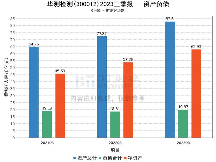 从资产负债方面看,华测检测2023年三季度的总资产为82.8亿元,相比上年度末的78.33亿元增长了5.71%。负债合计为19.87亿元,相比上年度末的21.59亿元减少了8.0%。这说明公司在资产管理上取得了一定的进步,同时也在积极优化负债结构。公司的净资产为62.93亿元,较上年度末的56.74亿元增长了10.9%,显示出公司自有资本的增长。资产负债率为24%,较上年度末的27.56%有所下降,这表明公司的财务结构更为稳健。