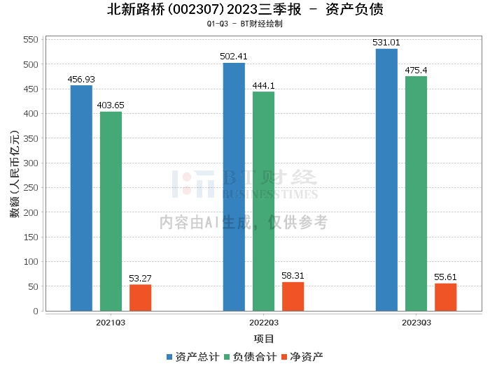 从资产负债方面来看,北新路桥2023年三季度的总资产为531.01亿元,相比上年度末的511.56亿元增长了3.80%。负债合计为475.4亿元,相比上年度末的456.09亿元增长了4.22%,资产负债率从上年度末的89.16%微升至本报告期末的89.53%。净资产为55.61亿元,与上年度末的55.47亿元相比略有增长。这些变动主要系本期新增短期借款和应付票据到期归还所致。