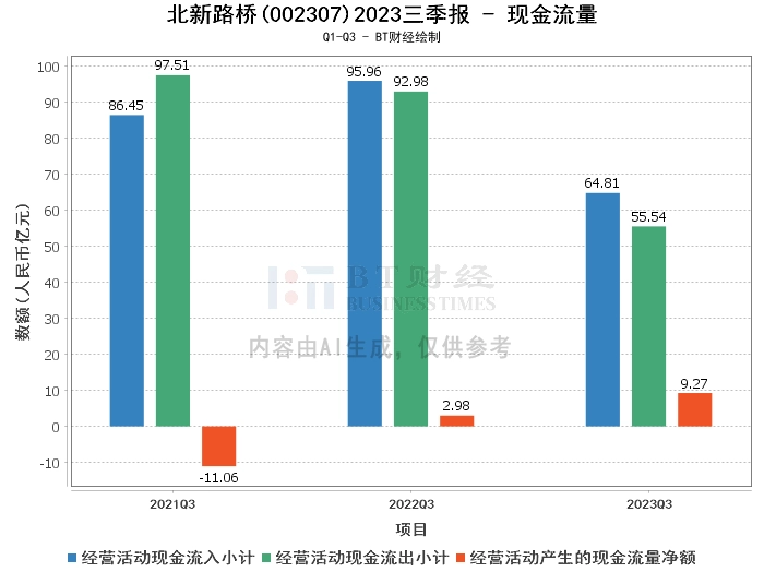 在现金流量方面,北新路桥2023年三季度经营活动产生的现金流量净额为9.27亿元,相比上年同期的2.98亿元增长了211.10%。这主要系本期长龙项目、南川项目、沪昆项目、和田巴格其镇改扩建项目、双河市G577线项目收到工程预付款所致。