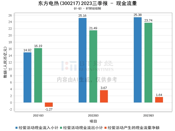 在现金流量方面,东方电热2023年三季度的经营活动产生的现金流量净额为1.64亿元,较上年同期的3.67亿元有所下降。经营活动现金流入小计为25.38亿元,较上年同期的25.16亿元有所增长。经营活动现金流出小计为23.74亿元,较上年同期的21.49亿元有所增长。这些数据显示,公司的经营活动现金流量净额有所下降,但经营活动的现金流入和流出都在稳步增长。