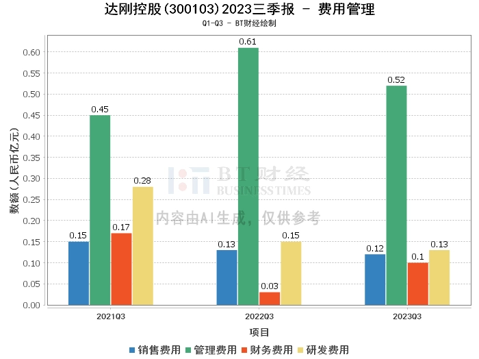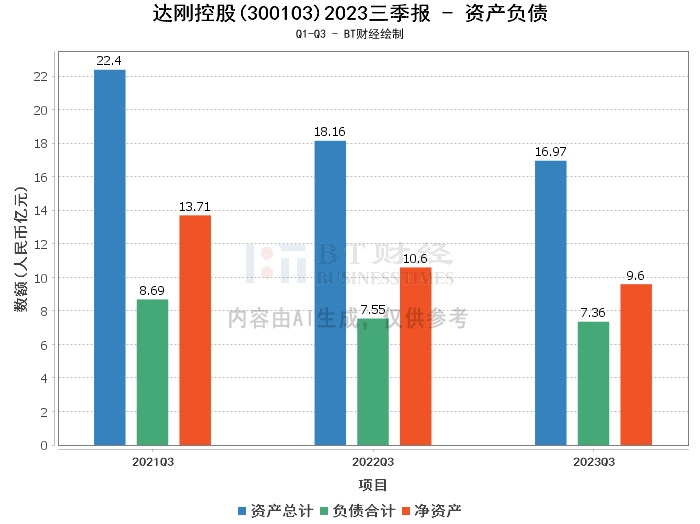 在资产负债方面,达刚控股2023年三季度的总资产为16.97亿元,相比上年度末的17.38亿元微降2.37%。负债总额为7.36亿元,与上年度末的7.32亿元相比略有增加。净资产为9.6亿元,相比上年度末的10.06亿元有所下降。资产负债率为43.39%,较上年度末的42.11%有所上升。这些变化的主要原因可能是公司在报告期内的经营活动和投资决策。