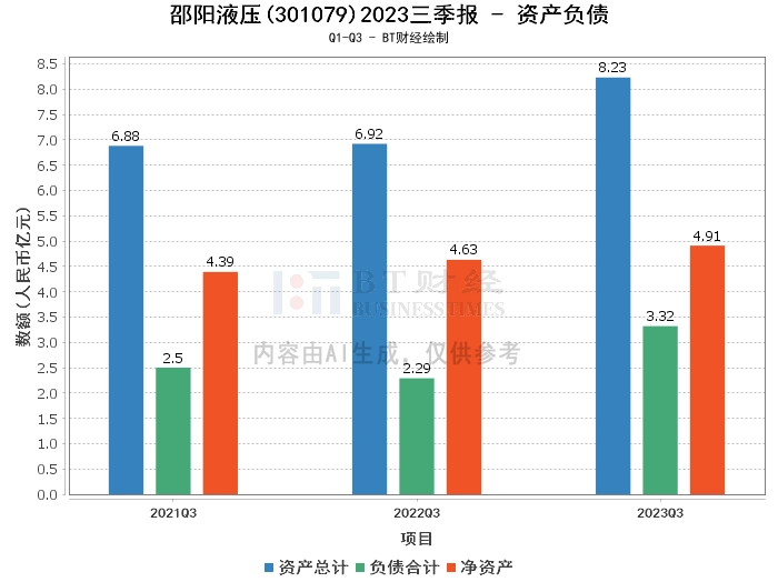 从资产负债方面来看,邵阳液压2023年三季度的总资产为8.23亿元,相比上年度末的7.79亿元有所增长。负债合计为3.32亿元,较上年度末的2.98亿元有所上升。净资产为4.91亿元,较上年度末的4.81亿元略有增长。资产负债率为40.39%,较上年度末的38.28%有所上升。