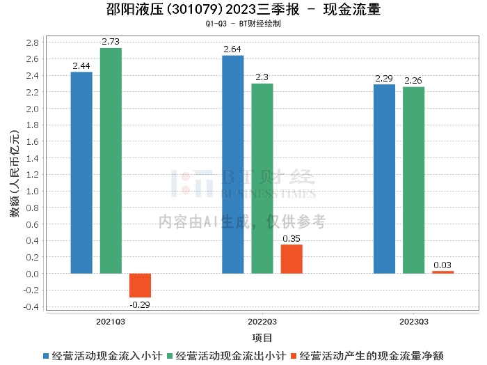 在现金流量方面,邵阳液压2023年三季度的经营活动产生的现金流量净额为308.16万元,较上年同期的3478.28万元大幅度减少。经营活动现金流入小计为2.29亿元,较上年同期的2.64亿元有所减少。经营活动现金流出小计为2.26亿元,较上年同期的2.3亿元略有下降。