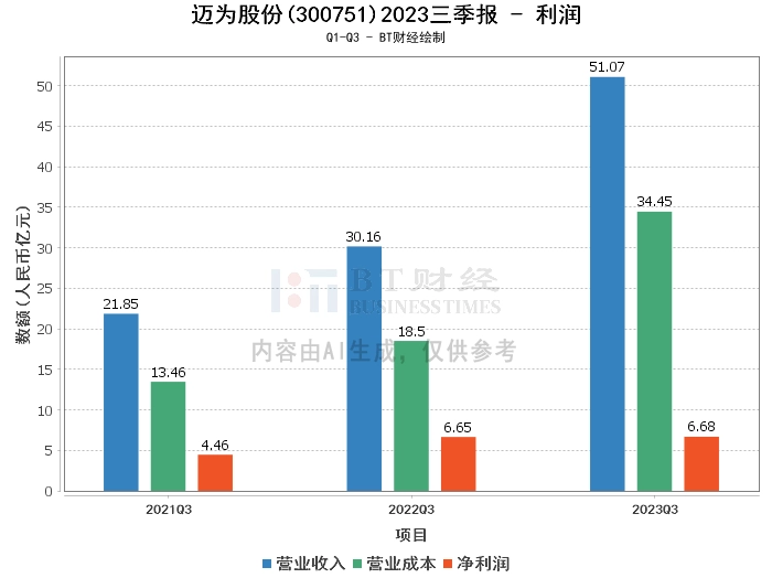 在利润方面,迈为股份2023年三季度的营业收入为51.07亿元,同比增长了69.35%,主要是公司主营业务产品太阳能电池生产设备销售增长,使得公司主营业务收入同比上升。营业利润7.49亿元,与上年同期的7.42亿元相当。营业成本34.45亿元,较上年同期的18.5亿元有所增长。净利润6.68亿元,与上年同期的6.65亿元基本持平。