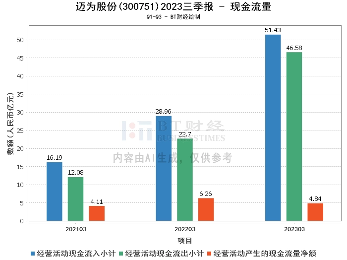 现金流量方面,迈为股份2023年三季度经营活动产生的现金流量净额为4.84亿元,较上年同期的6.26亿元有所下降。经营活动现金流入小计51.43亿元,较上年同期的28.96亿元有所增长。经营活动现金流出小计46.58亿元,较上年同期的22.7亿元有所增长。