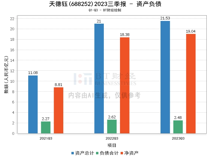 在资产负债方面,天德钰2023年三季度的总资产为21.53亿元,相较于上年度末的20.63亿元有所增长。负债合计为2.48亿元,与上年度末的2.49亿元相比基本持平。净资产为19.04亿元,较上年度末的18.14亿元有所提升。资产负债率为11.54%,较上年度末的12.08%有所下降。这些数据显示出公司的资产负债状况整体稳健。