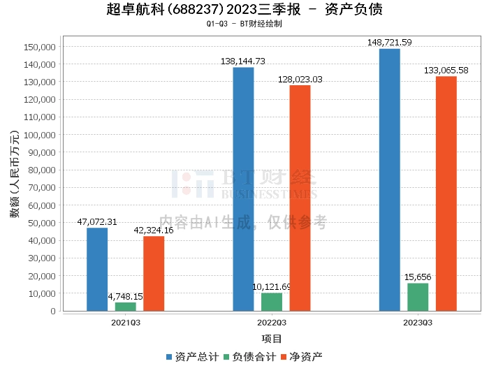 从资产负债方面来看,超卓航科2023年三季度末的总资产为14.87亿元,相比上年度末的14.46亿元有所增长。负债合计为1.57亿元,略高于上年度末的1.55亿元。公司的净资产为13.31亿元,较上年度末的12.91亿元有所提升。资产负债率为10.53%,较上年度末的10.7%有所下降。这些数据显示,公司的资产规模在稳步增长,负债规模基本稳定,整体财务状况良好。